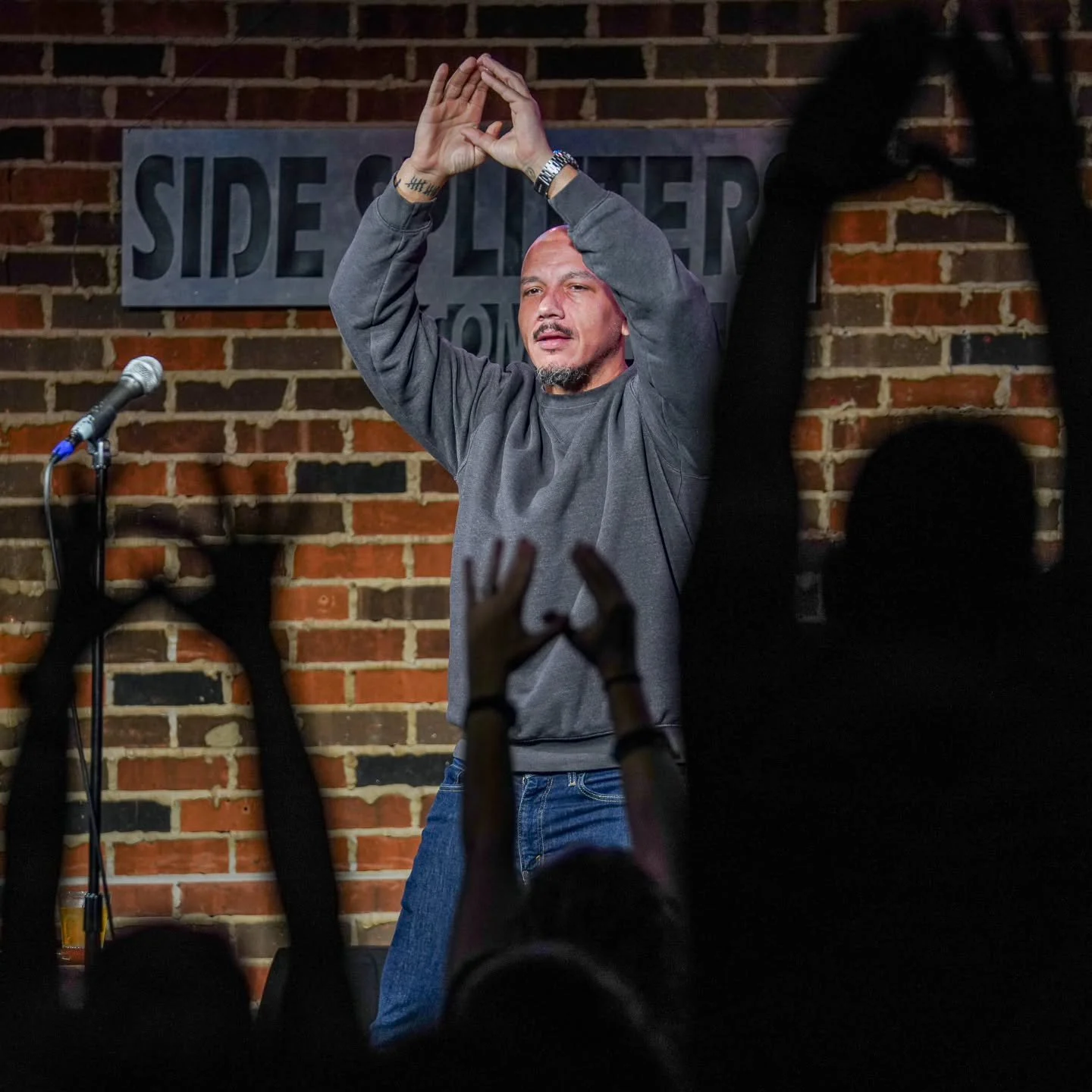 Comedian performing on stage with audience raising hands, microphone and "Side Splitters" sign visible.