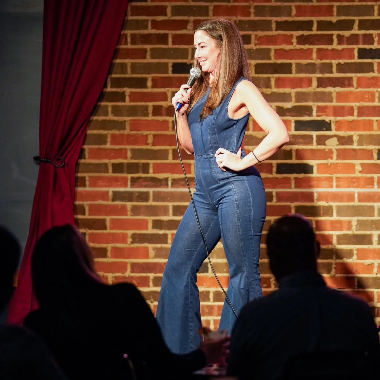 Woman in denim jumpsuit performing stand-up comedy on stage with microphone, brick wall background, red curtain, audience in foreground.