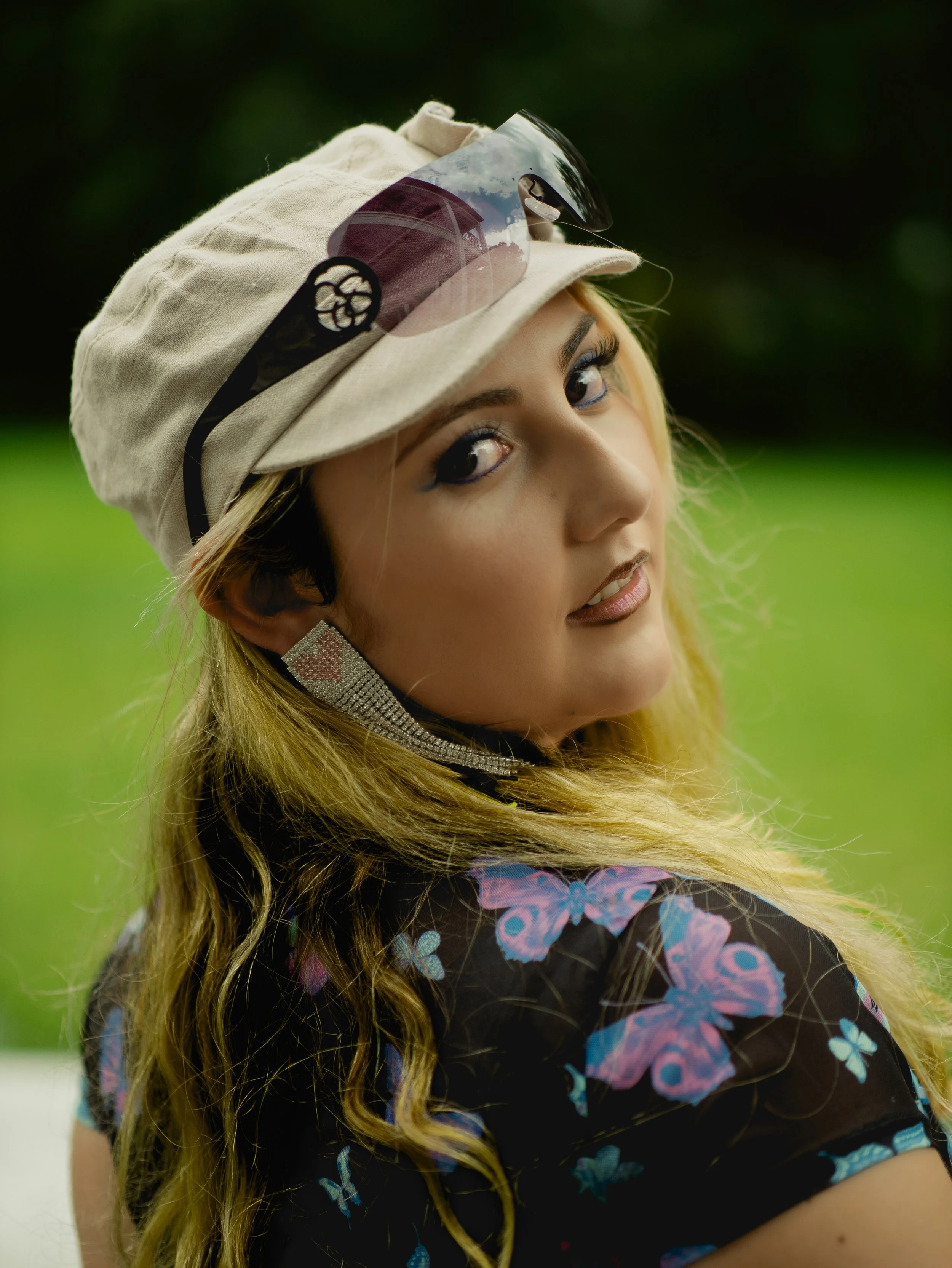 Person wearing a cap with "We're Better Together" text, green patterned shirt, black blazer, and blue jeans, posing on a metal structure outdoors with a blue sky and clouds in the background.