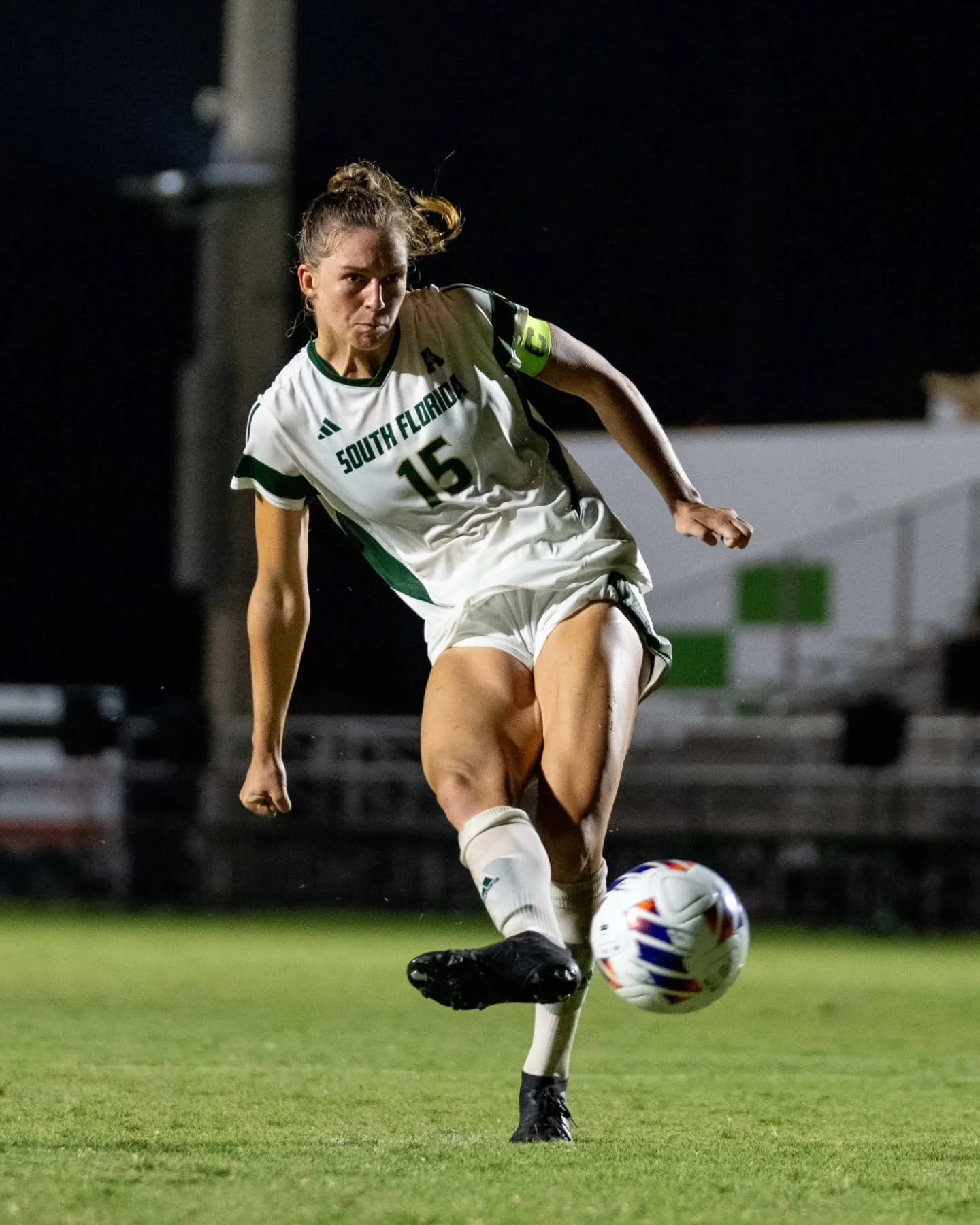 Soccer player in a South Florida uniform kicking a ball during a game at night.