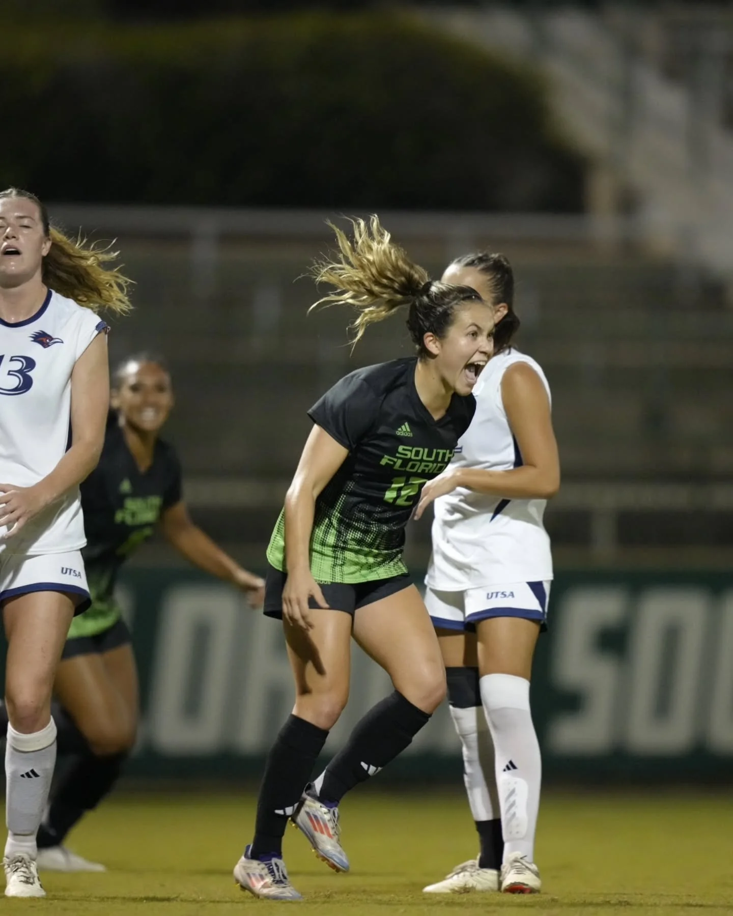 A women's soccer match featuring players from South Florida and UTSA, showing a South Florida player in a black and green jersey expressing excitement.